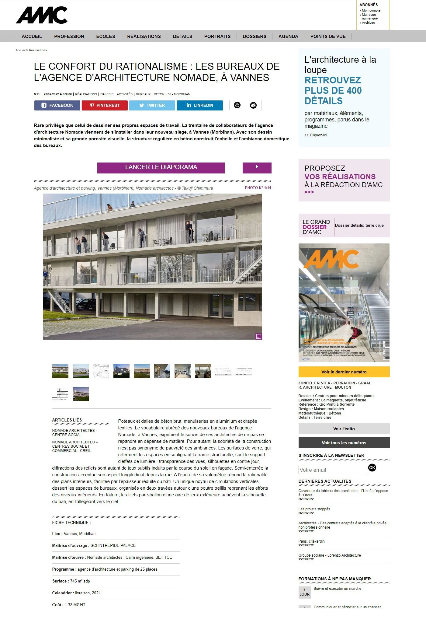 “ Rare privilège que celui de dessiner ses propres espaces de travail. La trentaine de collaborateurs de l'agence d'architecture Nomade viennent de s'installer dans leur nouveau siège, à Vannes (Morbihan). Avec son dessin minimaliste et sa grande porosité visuelle, la structure régulière en béton construit l'échelle et l'ambiance domestique des bureaux.”