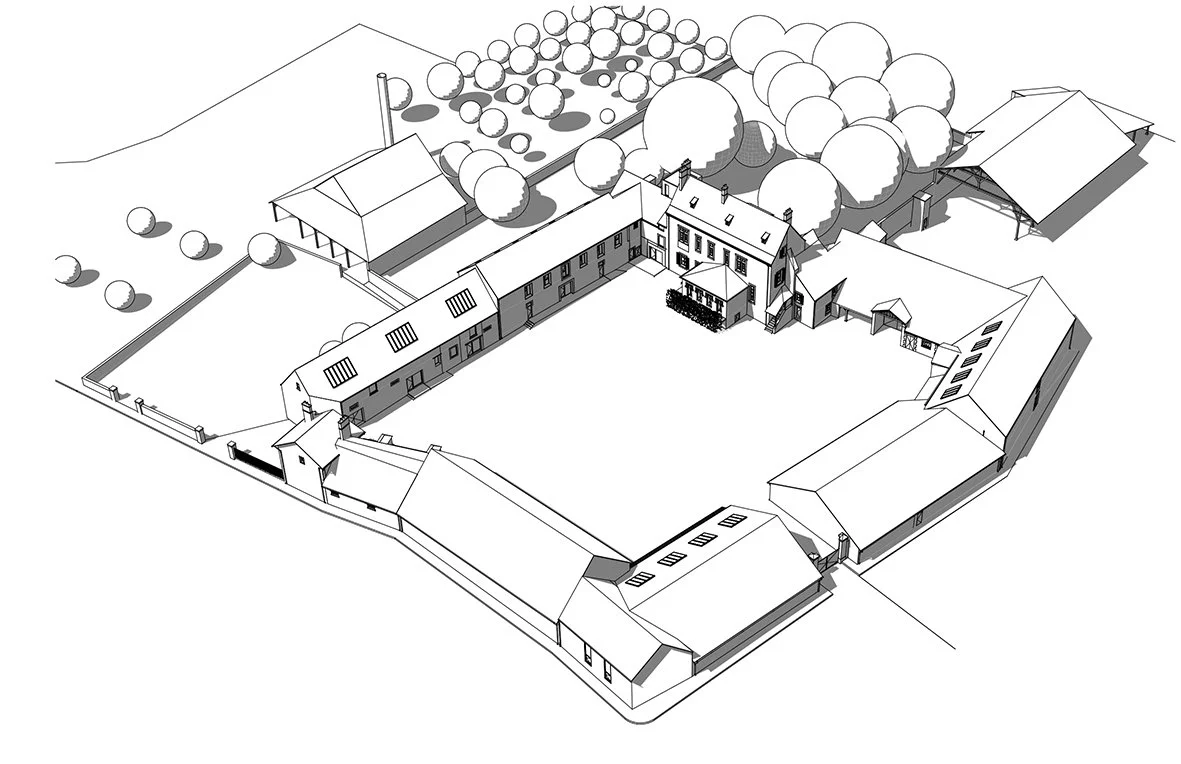 Compte-tenu des dispositions architecturales inhérentes au site, bâtiments aveugles pour la plupart, le parti architectural est d'ouvrir le plus possible en toiture afin de conserver les murs dans leur état. La grande majorité des ouvertures sont ainsi créées du côté intérieur de la cour afin de conserver l'aspect d'enceinte à l'extérieure de la ferme. Les ouverture prendront la forme de grandes verrières apportant un éclairage zénithale optimal pour l'éclairement de grands locaux d'enseignement. Toutes les ouvertures de baie ainsi que les menuiseries créées seront assumées contemporaine et sans mimétisme de l'existant. Le programme a demandé la création d'une nouvelle circulation verticale : elle a été l'occasion e créer un édicule émergeant des toitures: habillé de bardage de type Corten, le nouveau volume est résolument contemporain mais s'inscrit dans des teintes de matériaux en adéquation avec le site.