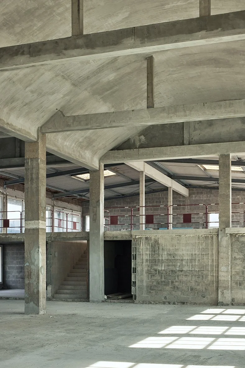 Construite en 1937, la Glacière Municipale d’Etel fait partie intégrante du patrimoine portuaire de l’époque de la grande pêche. Réalisé en béton armé et parpaings de ciment, cet édifice de plan quadrangulaire est divisé en deux vaisseaux parallèle, chacun couvert d’une voûte en berceaux en voile béton. La bâtiment est désaffecté dans les années 90. Propriété de la ville, la Glacière a vocation à jouer un rôle central dans l’animation et le développement de la commune et du territoire qui l’entoure en devenant un lieu vivant et ouvert à l’année. Désormais, elle accueille l’Office de Tourisme d’Etel, puis des collections du Musée des Thoniers d’Étel qui retraceront les grandes étapes de l’histoire portuaire de la Bretagne. Ainsi, pour préserver toute l’histoire du lieu, il est donc primordial de respecter l’existant, le système constructif et ce que chacun appelle « le génie du lieu ». La structure en poteaux-poutres est volontairement laissé apparente. Donner à voir le béton, ses défauts et ses aspérités laisse place à l’imaginaire.