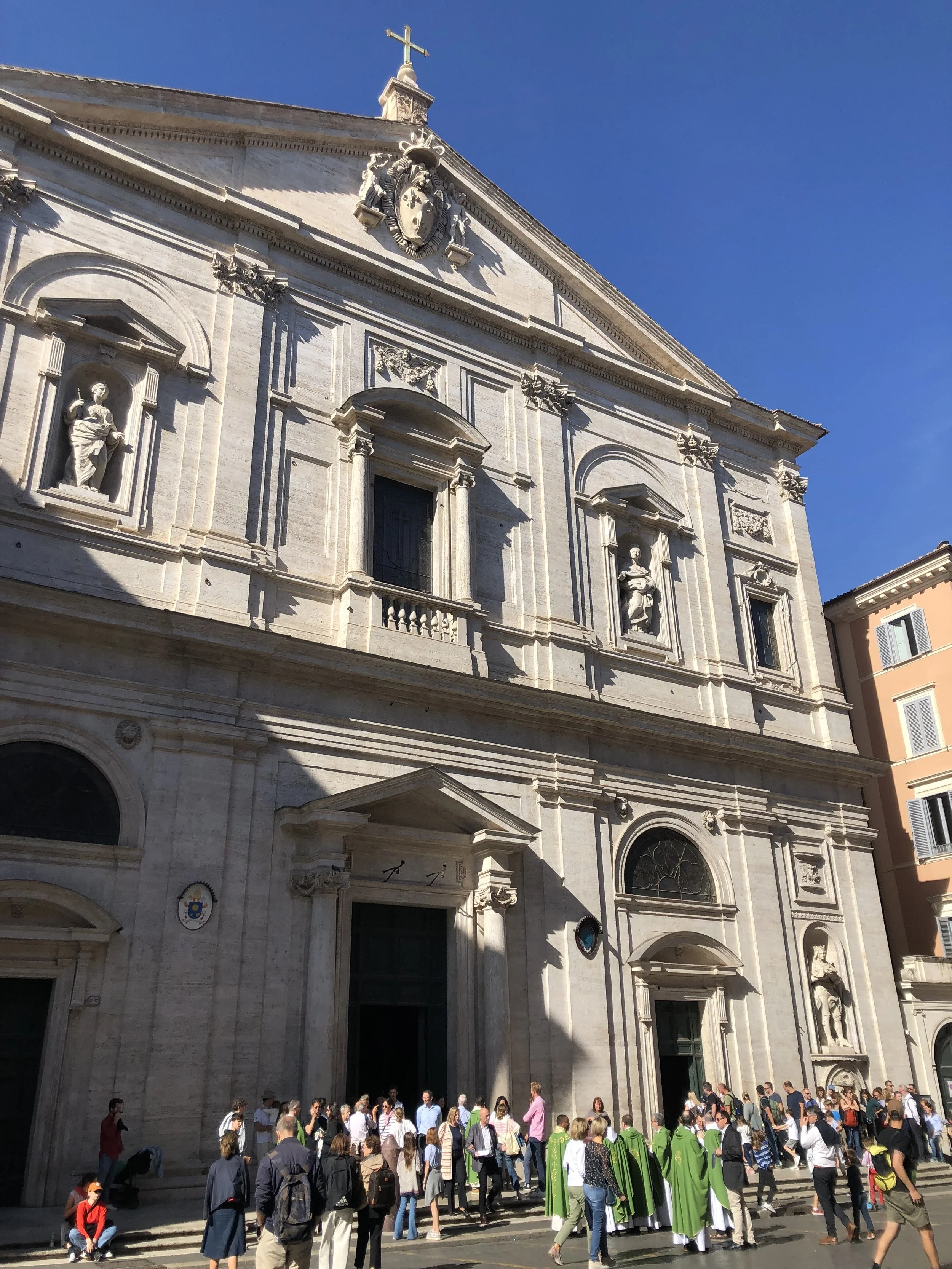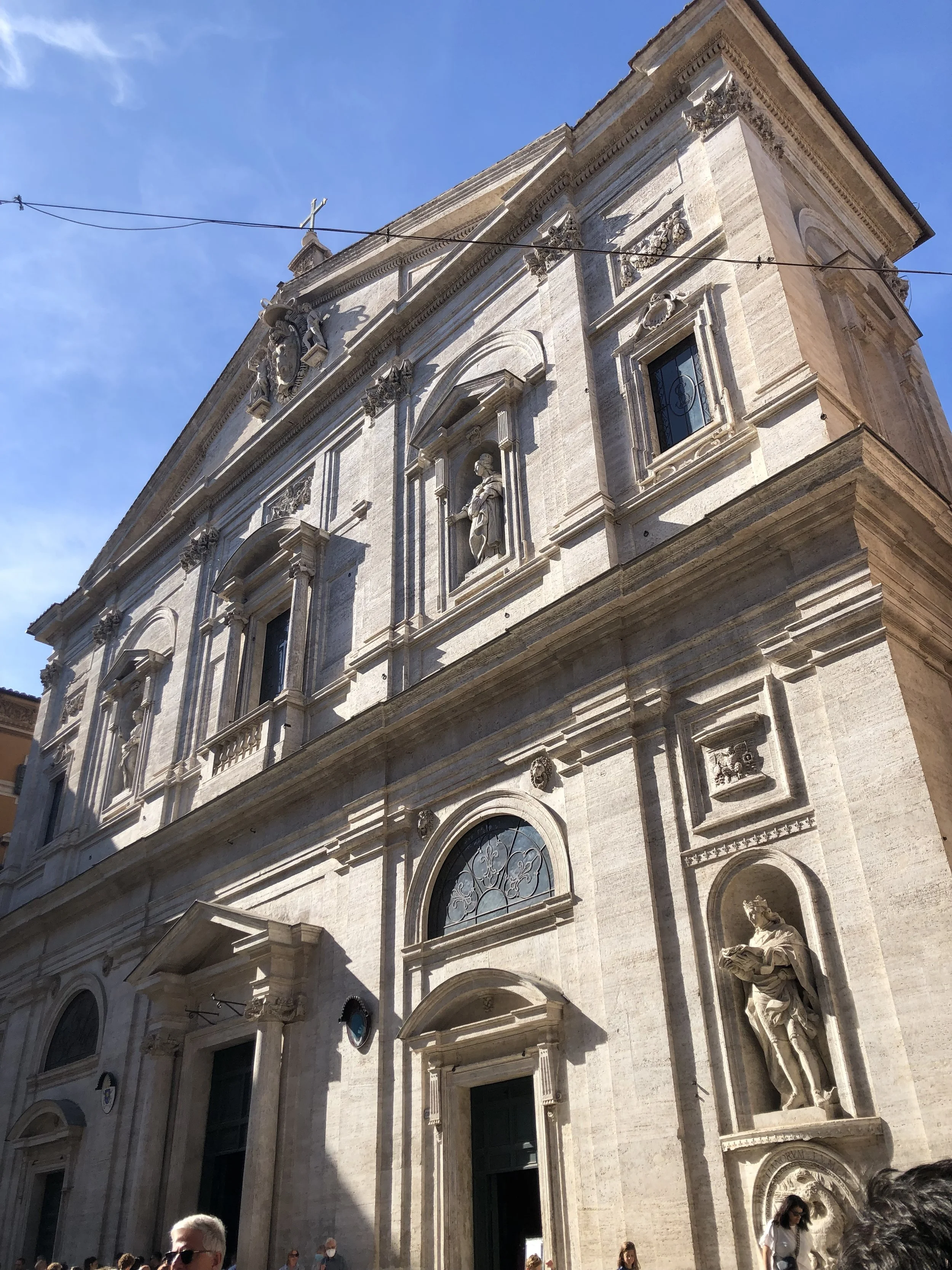 L’église Saint Louis-des-Français, dessinée par Giacomo Della Porta et principalement réalisée par Domenico Fontana, fut construite entre 1518 et 1589 sur des terrains appartenant aux Médicis avant d’être consacrée en 1589. Redécorée entièrement en 1756 par l’architecte Antoine Derizet, elle contient de nombreuses œuvres d’art qui illustrent l’histoire de la peinture, de la Renaissance à l’époque Moderne : Bassano, Caravage, Le Dominiquin, Natoire, etc...