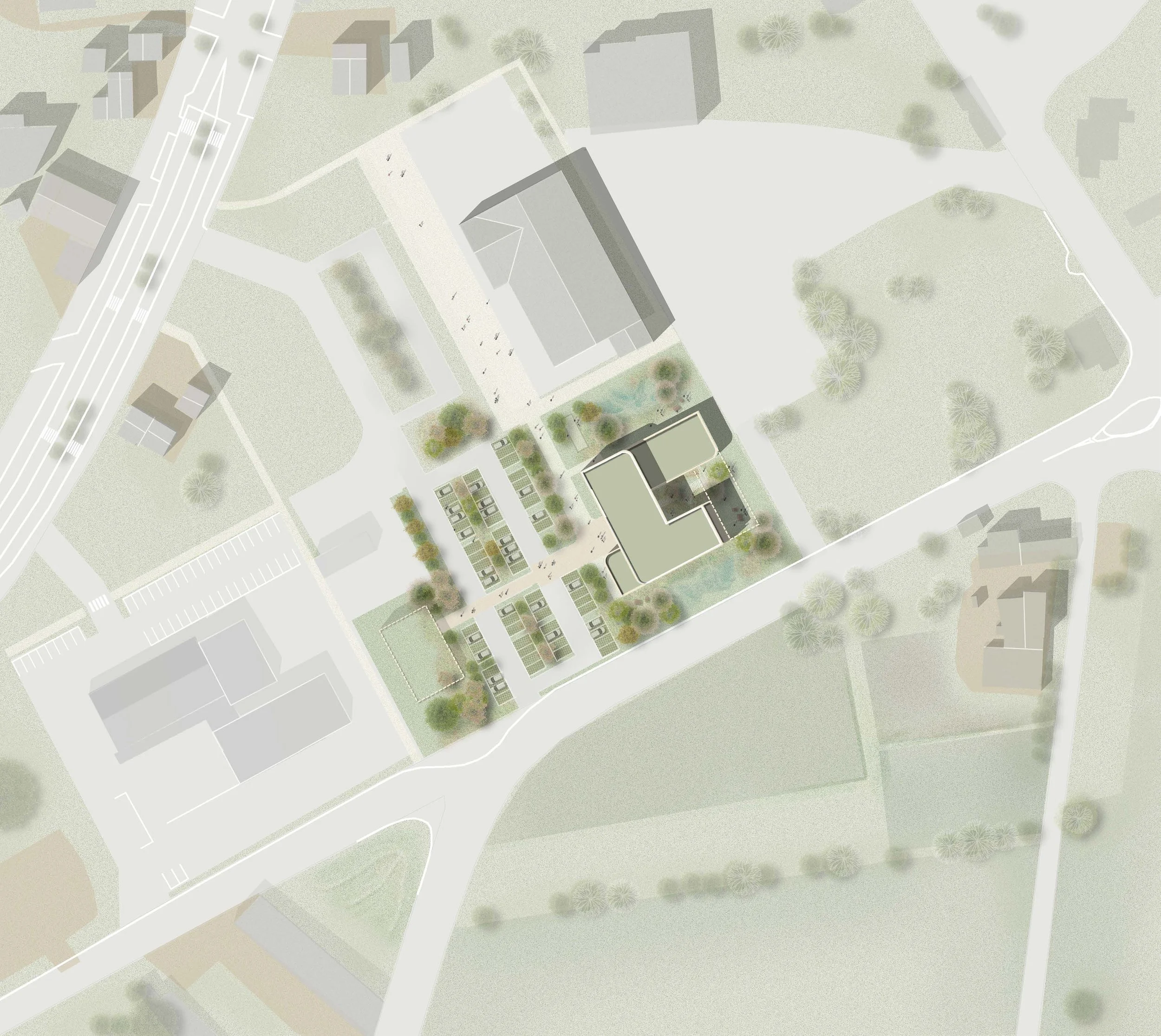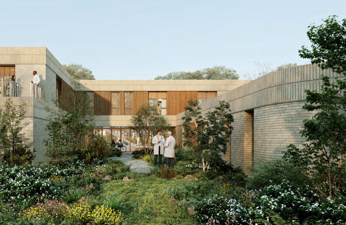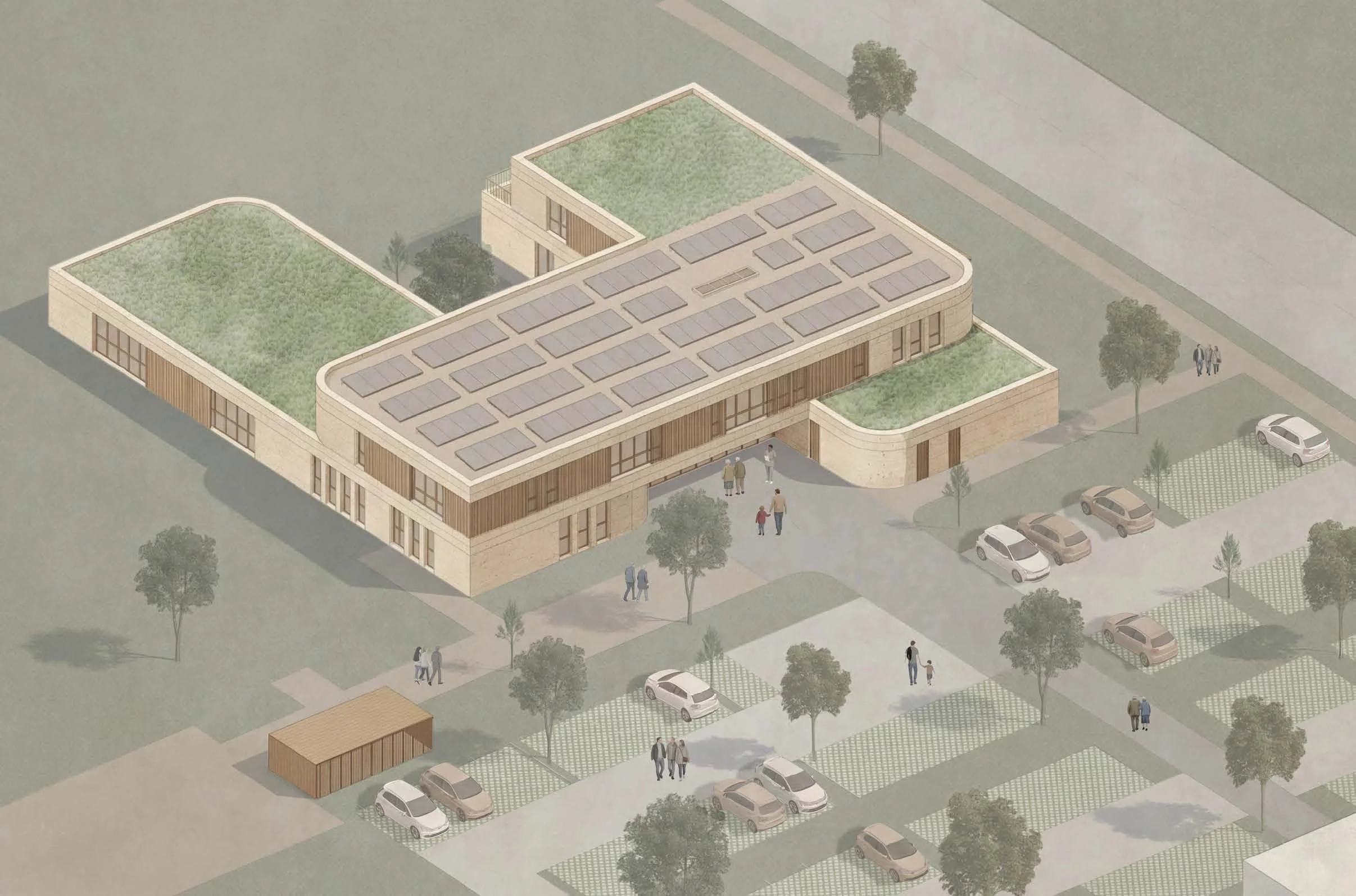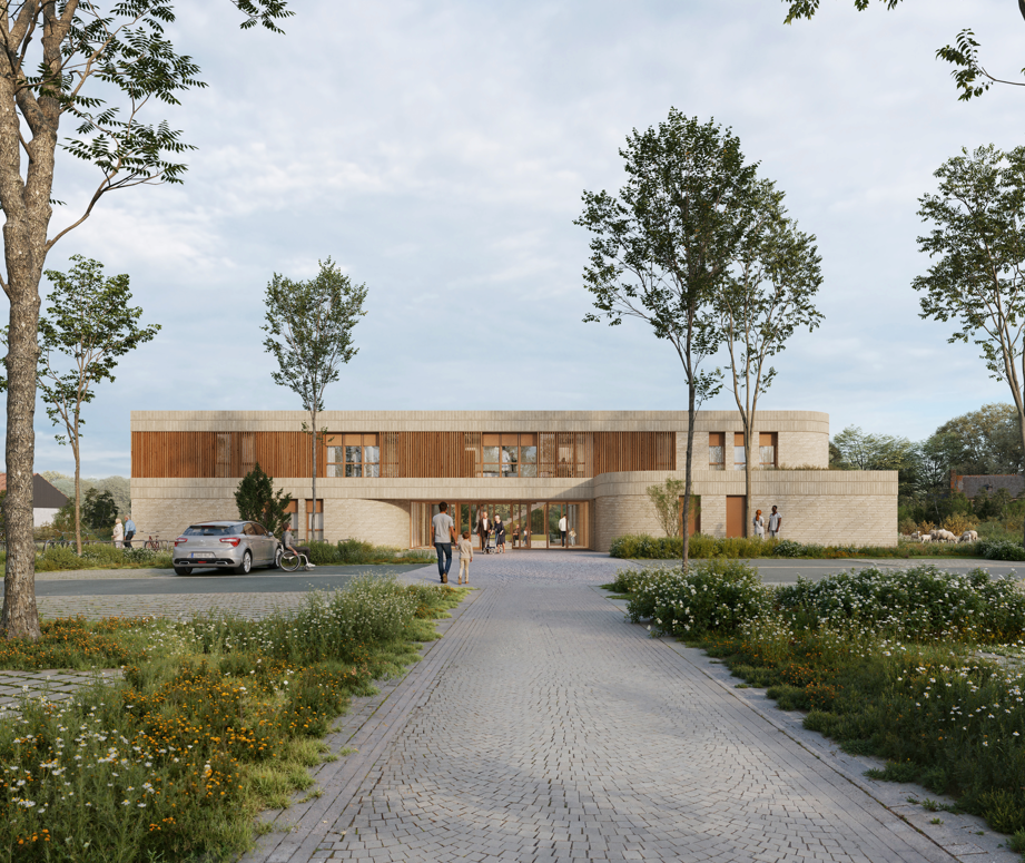Le projet réinterprète l’héritage industriel du site, une ancienne usine de carrelage, par un volume unitaire en brique beige clair, hommage aux briqueteries locales. Cette enveloppe pérenne, rythmée par des strates minérales et des filtres en bois de chêne, protège un intérieur pensé pour la sérénité. Organisé en « H », le bâtiment s’articule autour d’un patio végétalisé qui baigne de lumière les circulations et les salles d’attente. Ce plan garantit une séparation fluide entre le parcours des patients et les zones logistiques des praticiens. Alliant conception bioclimatique et haute performance acoustique, l’équipement offre un cadre de soin sain et confidentiel, tout en restant évolutif grâce à une structure permettant une extension future sans heurts. Entre son parking-jardin et ses toitures vertes, la MSP s’intègre avec simplicité et durabilité dans le paysage de Durtal.