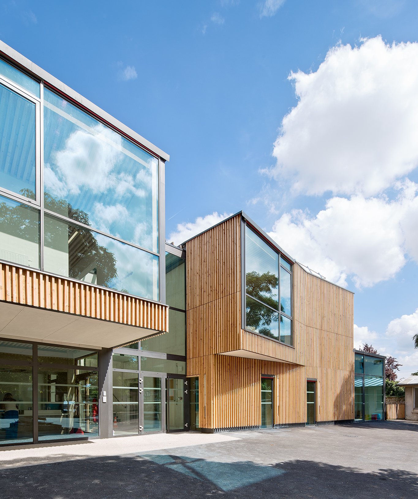 Le bâtiment se lit comme un original jeu de boîtes en bois qui s’imbriquent avec harmonie. La façade nord, qui joue un rôle de signal sur la place publique, est une introduction au parti architectural développé sur tout le bâtiment. Malgré la compacité du bâti dictée par une parcelle très contraignante et une démarche environnementale poussée, des décalages formels sur la cour et sur la place publique confèrent au projet son originalité. Le projet s’articule autour de patios, de doubles hauteurs, de très larges baies, qui permettent de capter les ensoleillements et de ménager des vues agréables. Le bâtiment est entièrement bardé de bois non traité.